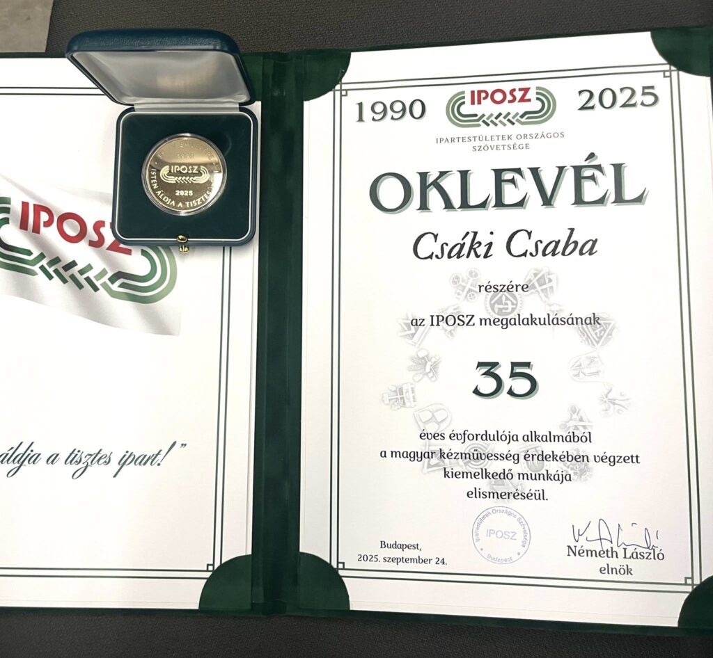 Ipartestületek Országos Szövetsége – IPOSZ 35 éves jubileum – Ünnepel a kézművesség, és a szakma!  Ma (2025.09.24.-én) egy különleges eseményen vettünk részt: az IPOSZ 35 éves jubileumi ünnepségén, ahol két kiemelkedő személyiségünket, Csáki Csabát , a Szobafestő-Mázoló-Tapétázó Országos Ipartestület alelnökét Csáki Csaba bemutatása Műszaki tanár, festő-mázoló-tapétázó mesterCsaládjában generációkon átível a mesterség szeretete: édesapja is festő és oktató volt, ma pedig fia viszi tovább a hagyományt. Csaba 21 évesen már a csepeli IPOSZ tagjaként szolgálta a szakmát, 1997 óta pedig saját cégét vezeti sikerrel. Neves munkái között szerepel a Gundel Étterem és a Szent Gellért Plébánia, valamint számos budapesti és vidéki szálloda. Aranykoszorús festőmesterként nemcsak gyakorolja, hanem alakítja is a szakmát:31 éve tagja az SZMTOI-nak, alelnökként a múlt ápolásáért, a jelen kihívásainak megoldásáért és a jövő építéséért dolgozik.Tanítványai között Európa-bajnok és ezüstérmes versenyzők is vannak, nemzetközi szakértőként a környező országok szakképzését is segíti. 2023-ban a Príma Díjjal ismerték el a magyar oktatás és köznevelés területén végzett munkáját.   Másik díjazottunk Tóth Antalt, örökös elnökünket akit  munkásságukért tüntettek ki.   Büszkék vagyunk rájuk, hogy példát mutatnak szakmai elhivatottságukkal és közösségépítő erejükkel!  Isten áldja a tisztes ipart!