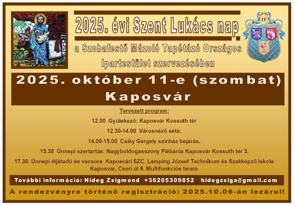 2025.10.10-11. Az ország minden tájáról érkeztek szombaton Kaposvárra, ekkor tartották ugyanis idén már huszonötödik alkalommal a Szent Lukács napi ünnepséget, ezúttal a somogyi vármegyeszékhelyen. Az ünnepet a Szobafestő, Mázoló, Tapétázó Országos Ipartestület szervezte, a nap a közösség, a szakmai összetartozás és a hagyományok jegyében telt. Ipartestületünk jelenlegi formájában 35. éve áll fent, és a 25. jubileumi Szt. Lukács megemlékezést szerveztük meg, nagyon nagy részvételi számmal (60 fő). Fotó: Stulic Milan A Szent Lukács napi ünnepség délelőtt városnéző sétával kezdődött, amelyen több mint negyven résztvevő fedezte fel Kaposvár építészeti és kulturális értékeit. A program részeként lehetőség nyílt a Csiky Gergely Színház megtekintésére is, ahol az épület felújításában részt vevő szakemberek osztották meg tapasztalataikat és élményeiket a projektről. Szent Lukács napi ünnepség. Fotó: Stulic Milan A Szent Lukács-nap hagyományaihoz hűen zászlószalagátadó- és áldó ünnepséget tartottak, idén a Kaposvári Nagyboldogasszony-székesegyházban, ahol a Somogyi Kereskedelmi és Iparkamara, valamint a Kaposvári Szakképzési Centrum képviselői kötötték fel az emlékszalagot az ipartestület zászlójára. Fotó: Stulic Milan Szent Lukács nap hagyománya Szent Lukács a festők és iparművészek védőszentje, október 18. pedig Szent Lukács ünnepe Európa-szerte. Sok országban ilyenkor szakmai közösségek, céhek és művészeti iskolák tartanak megemlékezéseket, kiállításokat és közös ünnepségeket. A hagyomány célja, hogy tisztelegjenek a kézművesség, a művészet képviselői előtt, akik mesterségükkel értéket teremtenek. – Az esemény rangját emelte az Ipartestületek Országos Szövetségének és az UNIEP nemzetközi festőszövetség képviselőinek jelenléte is. A szervezők elégedetten értékelték a napot, amely méltón folytatta a Szent Lukács-napi hagyományt, erősítve a szakma hazai és nemzetközi közösségét – mondta Hideg Zsigmond szervező. Fotó: Stulic Milan Az eseményen átvehették azon festőmesterek az okleveleiket, akik valamilyen (10-20-30 év) évfordulójuk volt, így együtt ünnepelhettük meg ezt a jeles eseményt. Bronz koszorús emléklapot vehetett át Huszka István festőmester Aranykoszorús emléklapot vett át Reviczki Imre festőmester Aranykoszorús emléklapot vett át Fábián László festőmester Aranykoszorús emléklapot vett át Kovács József festőmester Aranykoszorús emléklapot vett át Nagy Imre festőmester Aranykoszorús emléklapot vett át Tóth Antal festőmester Aranykoszorús emléklapot vett át Győri János festőmester Aranykoszorús emléklapot vett át Molnár György  festőmester   Az esti záróeseményre a KSZC Lamping József Technikum és Szakképző Iskolában került sor. A vacsorát a Széchenyi István Technikum szakács és felszolgáló tanulói biztosították, a program pedig jó hangulatú, táncos mulatsággal zárult. Isten áldja a tisztes ipart!
