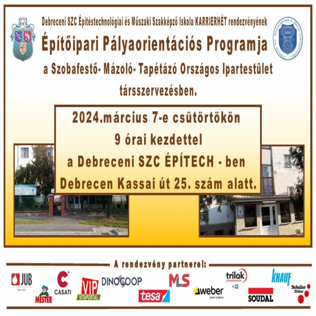 2024.04.04 Ybl Miklós Építőipari Technikum és Szakképző Iskolaban szervezett Építőipari Pályaorientációs Program nagy sikert aratott a tanulók és az iparági szereplők körében. A Szobafestő-mázoló-Tapétázó Országos Ipartestület által rendezett eseményen részt vevő cégek, köztük a JUB, MESTER, VIP VITAPORTAL, DINOCOOP, MLS, TRILAK, és SOUDAL, elhozták legújabb innovációikat és bemutatták termékeiket, eszközeiket. A rendezvény célja az volt, hogy felhívja a figyelmet az építőiparban rejlő karrierlehetőségekre, valamint, hogy összekösse a vállalatokat az iparágra kíváncsi diákokat. A résztvevő cégek által felkínált lehetőségek és információk gazdag tárháza lehetővé tette a diákoknak, hogy képet alkossanak az építőipar sokszínű és perspektivikus világáról.Összességében az esemény egy sikeres összefonódást teremtett a tanulók és az építőipari szereplők között, és hozzájárult az iparág jövőjének fejlesztéséhez. https://www.facebook.com/share/p/npScWPycLoSC4Yvm/