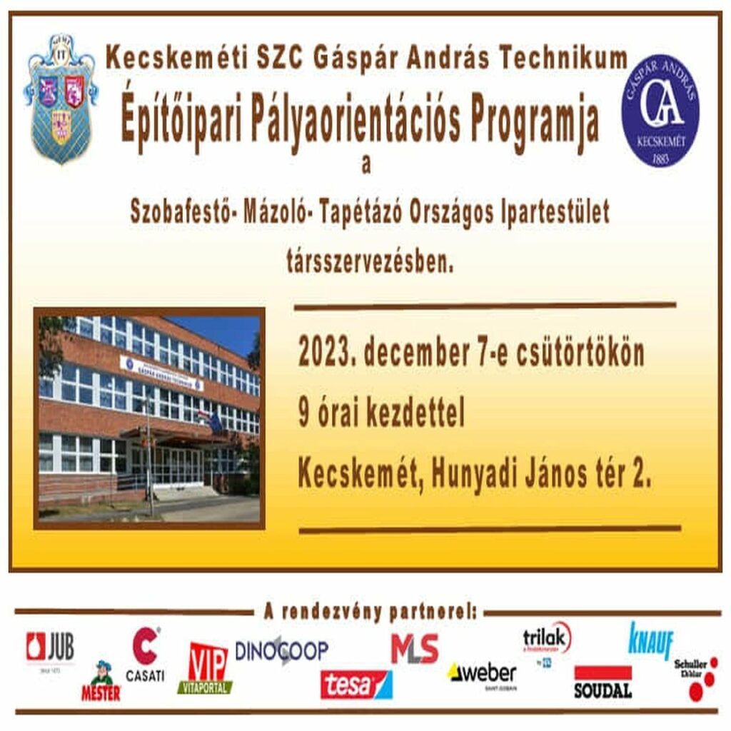 2023.06.07.-én A Kecskeméti Szakképzési Centrum Gáspár András Technikumában az SzMTOI által szervezett pályaorientációs szakmai napot tartottunk.Az építőipari tanulóknak szervezett nyílt nap célja, hogy a gyerekek megismerkedjenek a legújabb építőipari eszközökkel, szerszámokkal, technológiákkal, a minőségi anyagokkal. A szakmai bemutatók azt a célt szolgálják, hogy a tanulók nagyobb tudással és bővebb információ birtokában készüljenek a pályaválasztásra, magabiztosan ki tudják választani az érdeklődési körüknek megfelelő szakmát, melyben később sikeresen el tudnak majd helyezkedni. A kiállításon 13 festékipari cég képviseltette magát, és több mint 170 tanuló fordult meg a  rendezvényen. Az SZMTOI képviseletében Kovács László Zoltán volt a helyi szervező.
