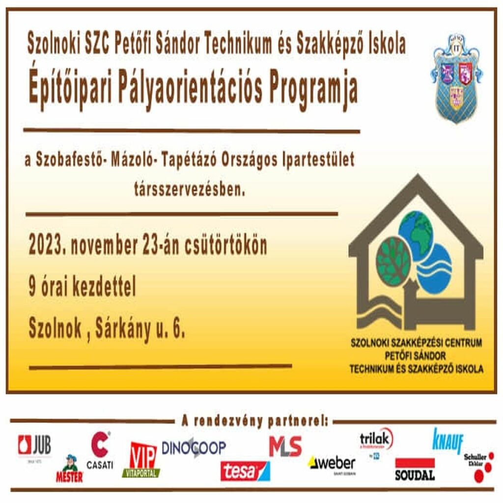 2023.november 23. Szolnoki SZC Petőfi Sándor Építészeti és Faipari Technikum és Szakképző szakmanépszerűsítő rendezvényén kiemelt szerepet kapott az építőipari ágazat. A festő szakma megújulásának lehetőségét mutatták be a hazai piacvezető cégek (12 cég bevonásával). A Szobafestő Mázoló Tapétázó Országos Ipartestület (SZMTOI) részéről Nagy András vett részt a Petőfi Iskola oktatójaként a szervezésben. Az Petőfi Iskola volt, a nyílt napjával összekötve a házigazda, a tanműhely adta a helyszínt. A rendezvényen nagyon nagy volt az érdeklődés, sok tanuló kereste fel a kiállítókat, standokat. Köszönjük a lehetőséget az iskolának! https://www.facebook.com/share/p/12zv4SbLayFonX4Q/