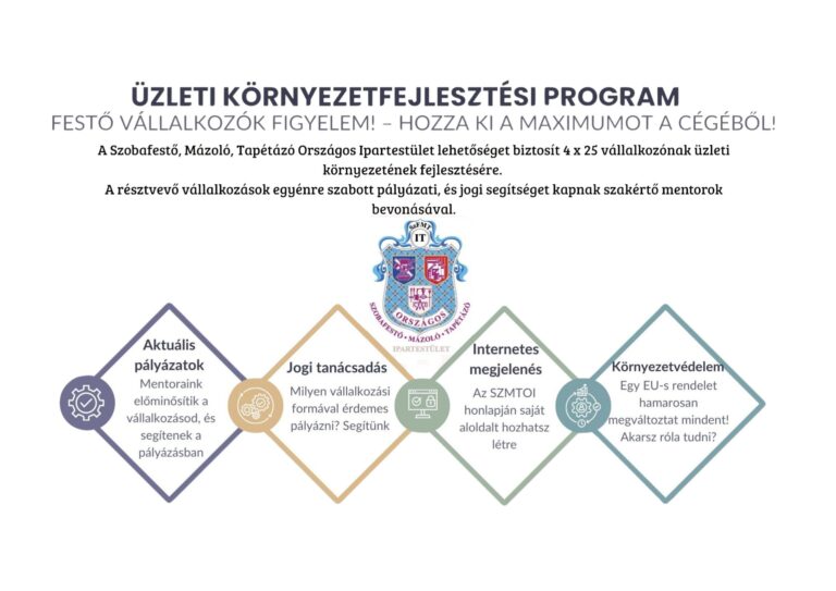 A Szobafestő, Mázoló, Tapétázó Országos Ipartestület (SZMTOI) különleges lehetőséget biztosít tagjai számára: elindítjuk Üzleti Környezetfejlesztési Programunkat, amelyben 4 x 25 vállalkozónak segítünk a szintlépésben! A pályázat helyszínei Kecskemét, Szeged, Érd, Győr lesznek. Regionálisan minden városból, és környékéről várunk 25 vállalkozót (elsősorban tagjainkat).